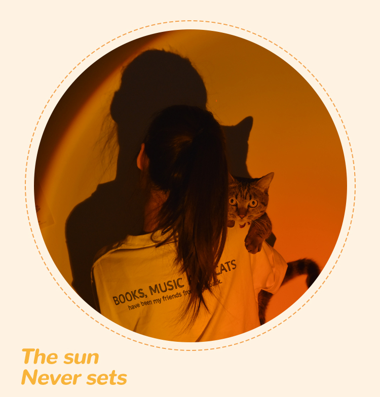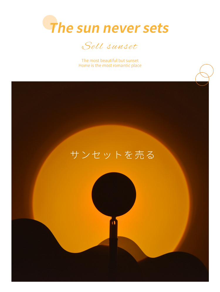Product name:Sunset / RainbowLights Size:80*67*270mm Input:5V-1A Power:5W Color Temperature:100-1900K Package Size:101*95*320mm Carton size:510*250*410mm Box Gauge:20/box